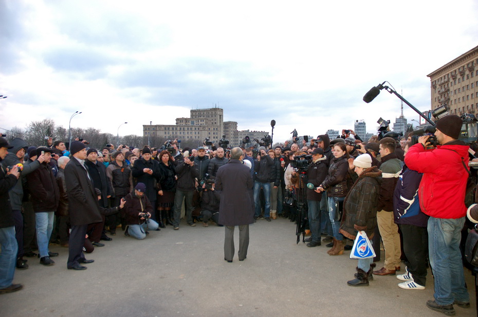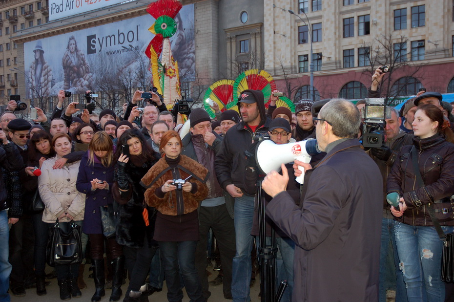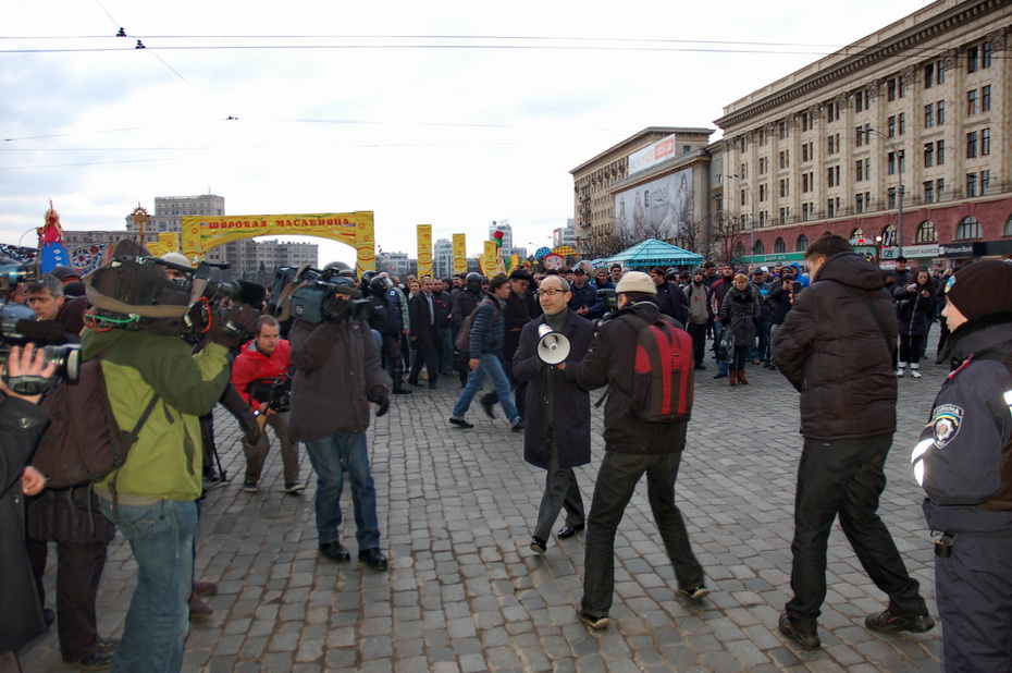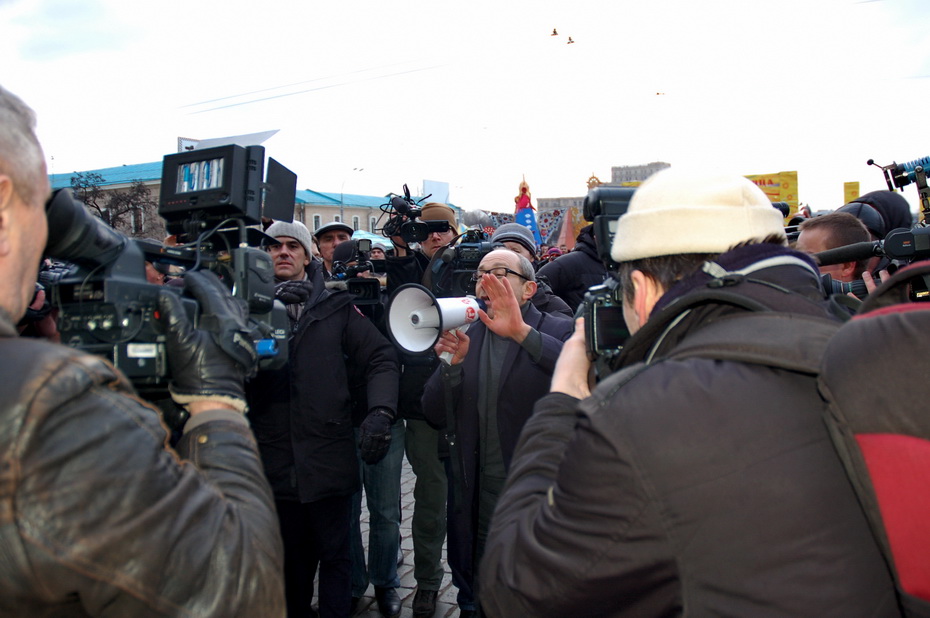 Берёт мегафон, просит тишины. Под крики «Ганьба!» и «Кернеса на нары!» мэр сообщает, что не хочет конфликтов.