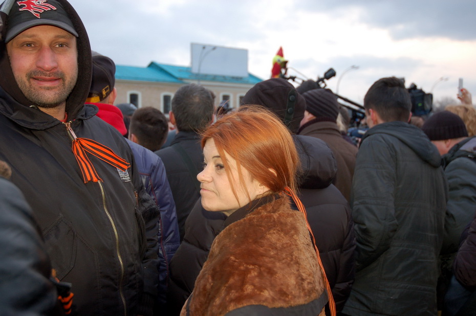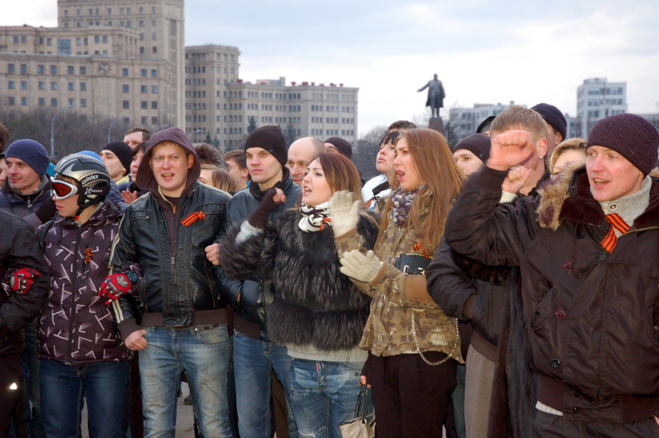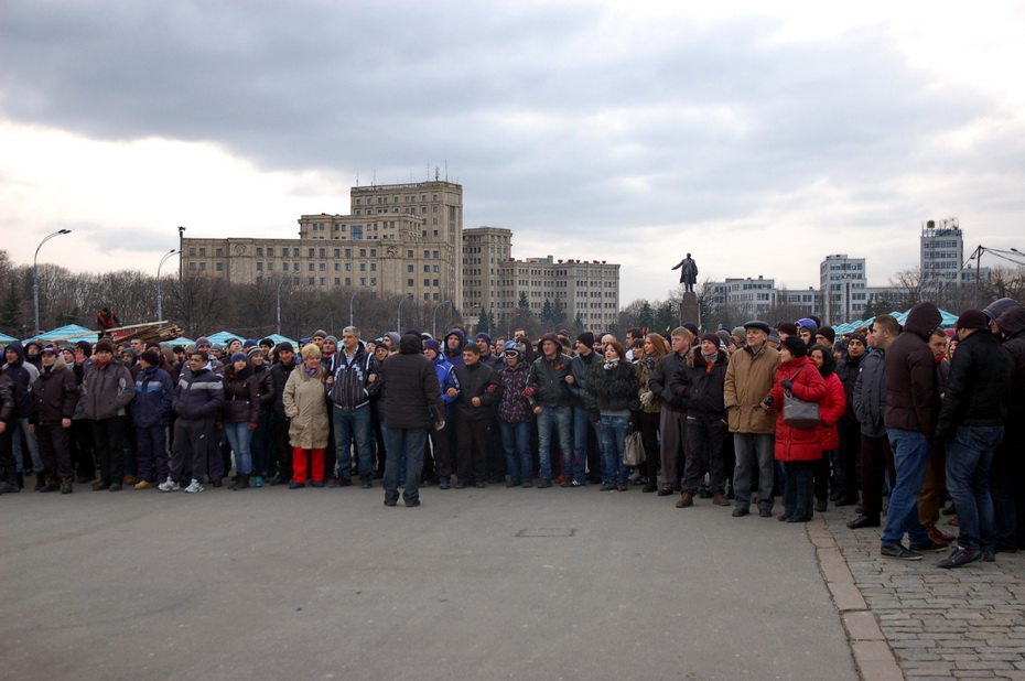 Ближе к памятнику Ленина — люди, которые пришли защищать монумент. Часть из них стояли под памятником уже с утра. На многих —георгиевские ленточки. Их лозунги: «Харьков не сдадим!», «Кернес мы с тобой!»