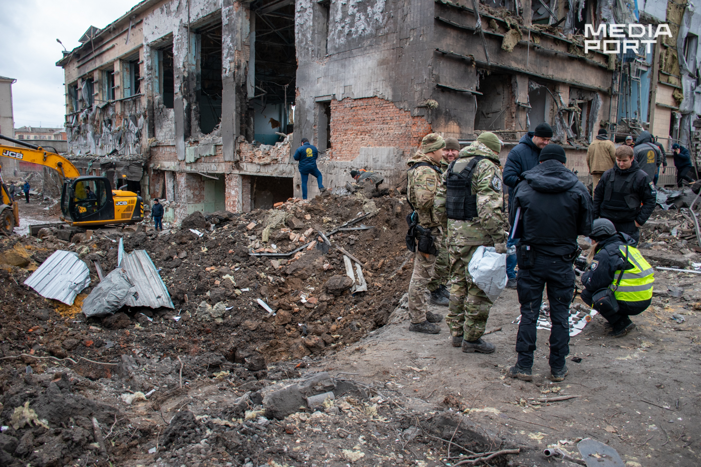 Уточнено о 15:23: Як повідомив начальник Слідчого управління поліції Харківщини Сергій Болвінов, попередня інформація про те, що однією з ракет був «Кинджал», не підтвердилася, огляд уламків триває.