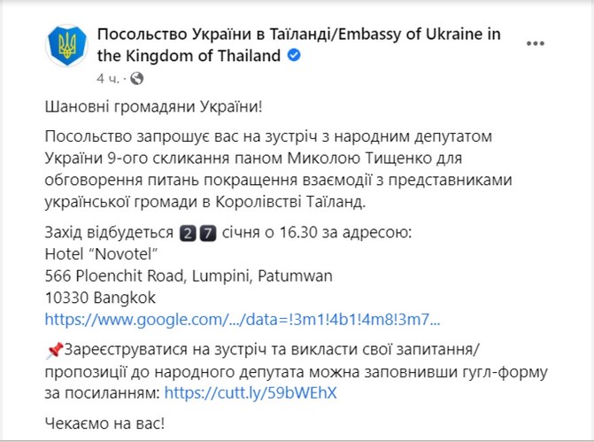 «Шановні громадяни України! Посольство запрошує вас на зустріч із народним депутатом України IX скликання Миколою Тищенком для обговорення питань покращення взаємодії з представниками української громади у Королівстві Таїланд», — йшлося у повідомленні на сторінці посольства у Facebook.