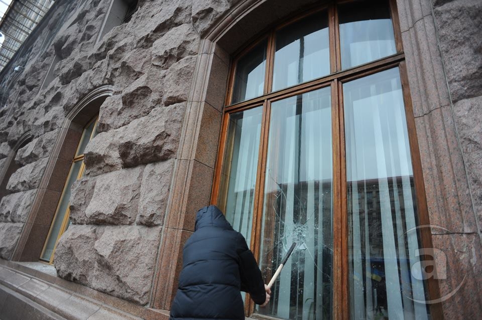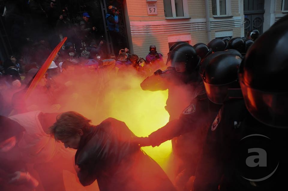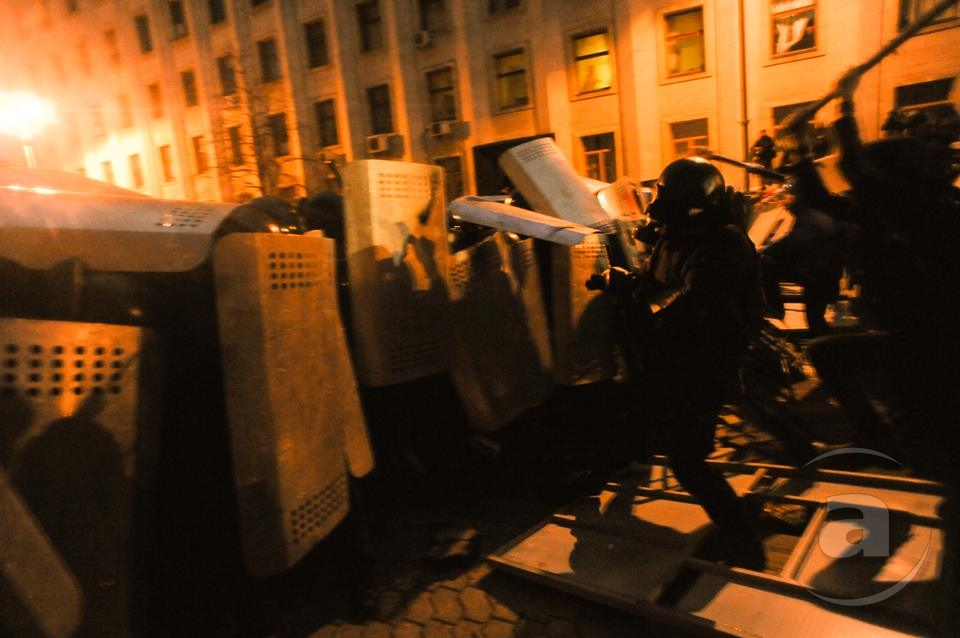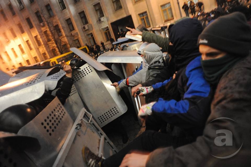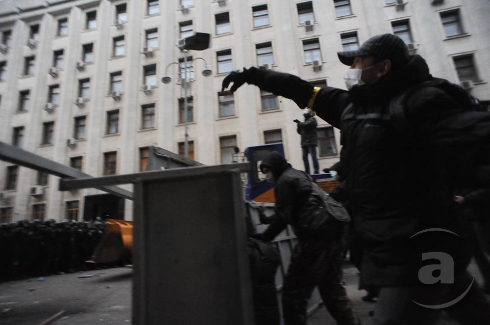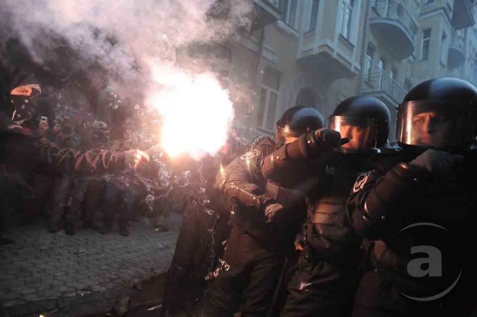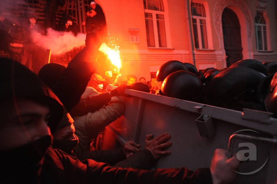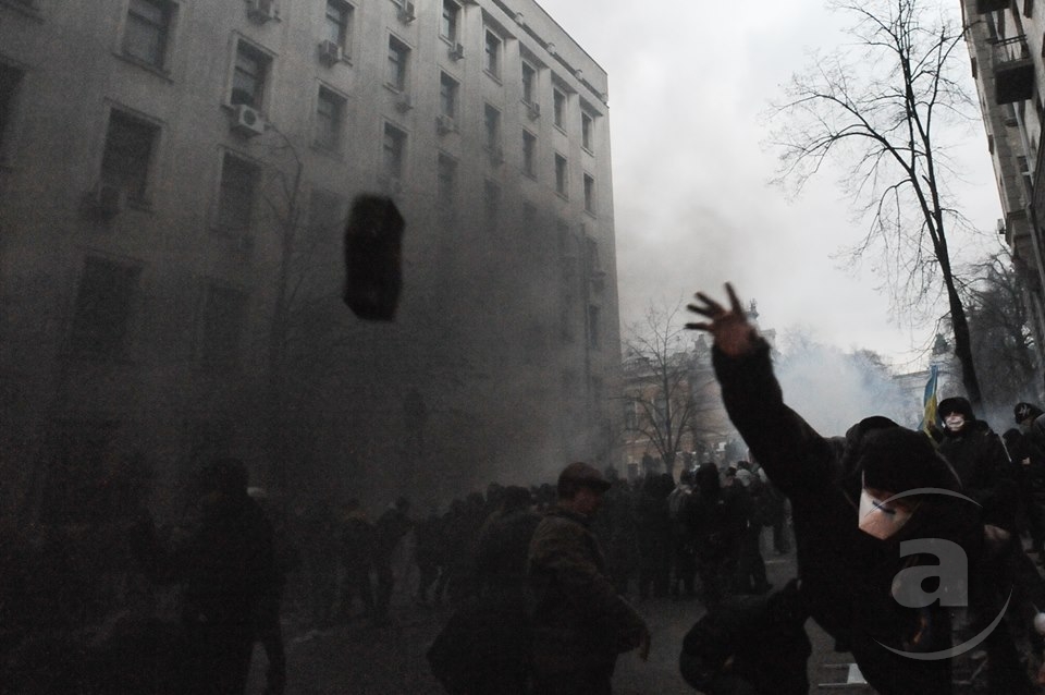 Два штурма. Утром Киевсовет, днём Администрация президента. Оба — очевидно не мирные. Оба оппозиция не признала своими. Информация об участниках и зачинщиках — противоречивая. У Киевсовета обошлось разбитыми стёклами. На Банковой было громко, серьёзно и очевидно опасно. Среди пострадавших — больше десяти журналистов. Многие из них получили травмы, несмотря на то что отчётливо представились «Беркуту». За эти фото фотографу «МедиаПорта» Мстиславу Чернову тоже основательно досталось. Впрочем, он просил обойтись без этих «неинтересных подробностей».