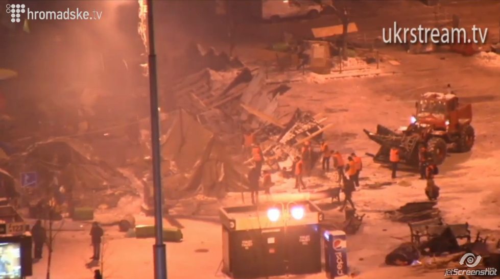 Силовики наступают сплочёнными рядами, вклиниваются между протестующими и вытесняют их. Наступление происходит рывками; следом на опустошённую территорию подходят сотрудники городских служб и быстро разбирают баррикады, сносят палатки. Майдан плотно окружён со всех сторон. На сцене певица Руслана Лыжычко призывает к непротивлению и обращается к силовикам с призывом не использовать силу. Комендант Майдана Андрей Парубий координирует действия протестующих. Люди поют гимн Украины. Звонят колокола Михайловского собора.