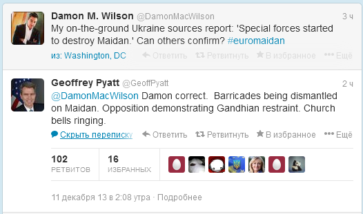 «Мы уже знаем, чего можно ожидать. Призывы сесть за «круглый стол» — абсолютно неправдивы, так как милицейская операция проходила на майдане ещё во время присутствия Кэтрин Эштон (глава дипломатии Евросоюза — ред.). Это также показывает, что Янукович с этими аргументами диалога абсолютно не считается».