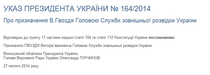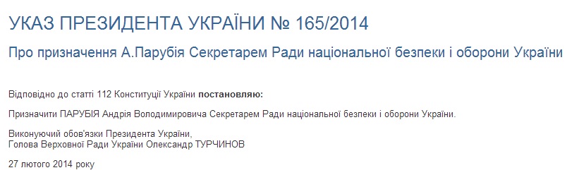 Секретарём Совета национальной безопасности и обороны Украины назначен комендант Майдана Андрей Парубий, главой Службы внешней разведки — Виктор Гвоздь.