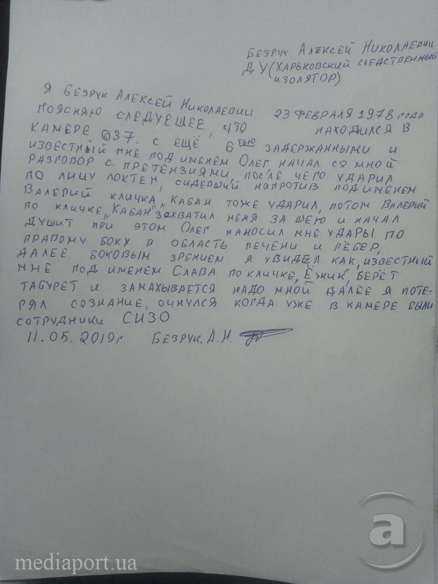 В поясненні він пише, що перебуває у камері ще з шістьма затриманими. Один з них почав розмову «з претензіями, після чого вдарив по обличчю, локтем», після цього били інші співкамерники. Зі слів підозрюваного, останнє, що він пам’ятає перед втратою свідомості, що один зі співкамерників замахнувся табуретом.