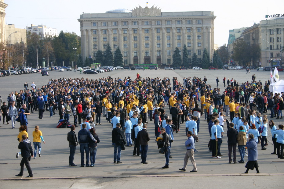 Сегодня в полдень на площади Свободы харьковчане установили рекорд по «массовому отжиманию». Более 700 человек одновременно выполняли физические упражнения.
