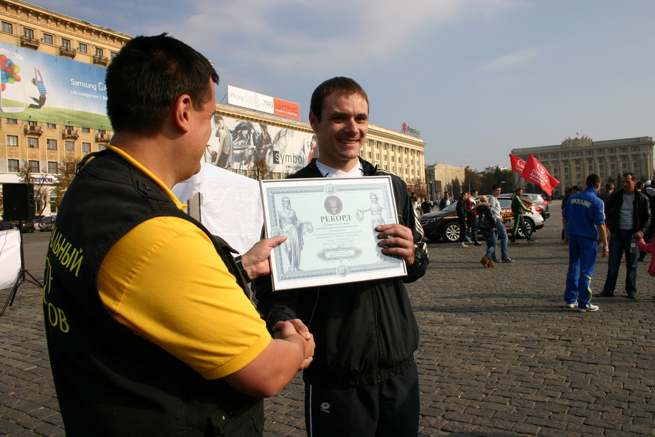 Виталий Зорин, эксперт Национального реестра рекордов Украины: «Сегодня в Харькове списочное количество участников было 725, правда, немного правый фланг филонил. Там 13 человек не отжималось вообще. Ну, не знаю, может двоечники! И трое человек отжимались вне зоны подсчёта. Итого получилось, что фактическое количество участников рекорда 715 человек».