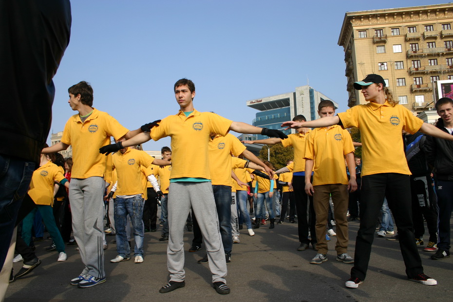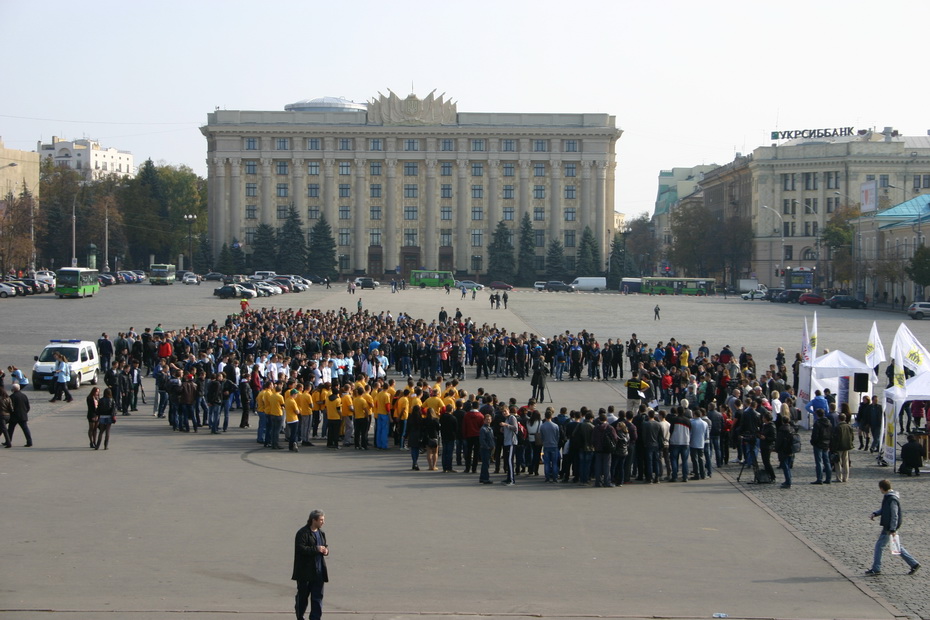 С утра к памятнику Ленину на площади Свободы подтягиваются студенты. Цель — побить рекорд по массовому отжиманию, который в мае 2012 года установили киевляне. Тогда отжиматься пришли 238 человек.