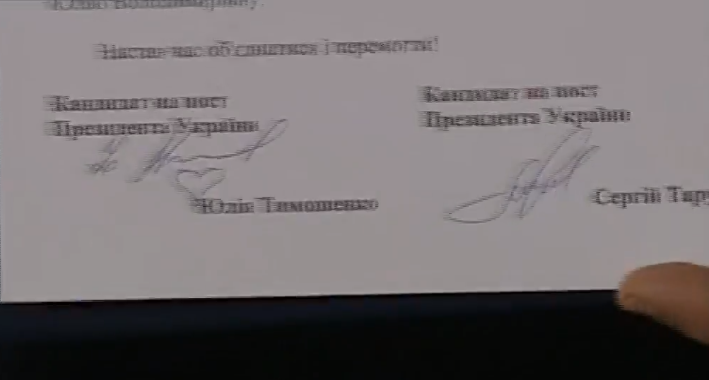 Біля свого підпису меморандуму про об’єднання, яку тримав під час прес-конференції Тарута, Тимошенко лишила малюнок у вигляді сердечка.