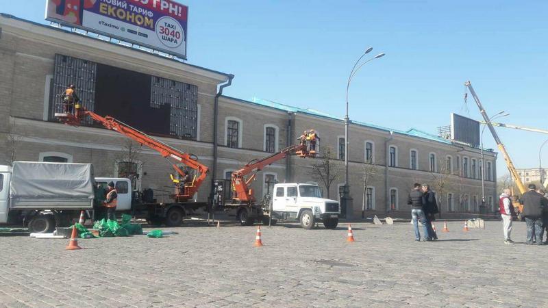 Наразі біля будівлі Палацу стоять вантажівки комунального підприємства «Міськелектротранссервіс» і автовежі. Робочі знімають елементи екрану, встановленого на рівні другого поверху.