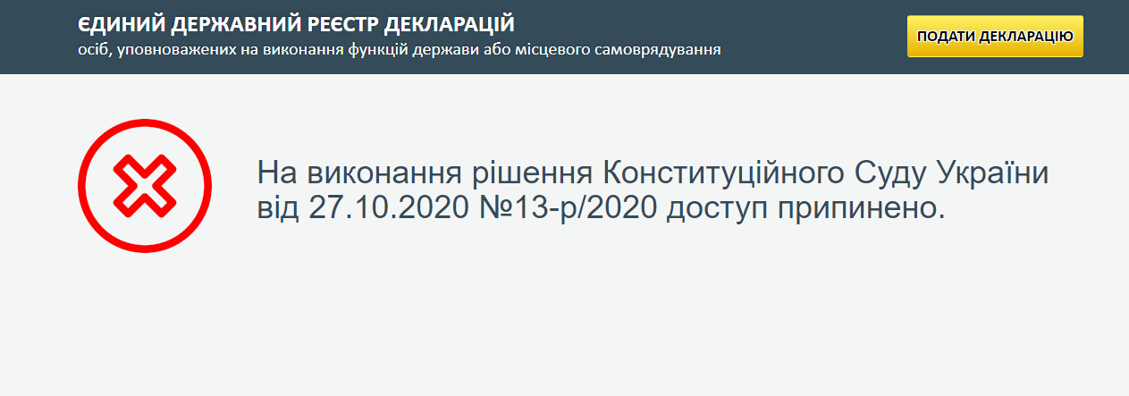 «Це означає, що державні органи та громадськість більше не мають відкритого цілодобового доступу до електронних декларацій посадовців, а НАЗК припиняє їхню перевірку, зберігання та оприлюднення», — заявили в НАЗК.