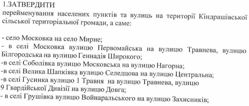 Для села Московка у Кіндрашівській громаді Куп’янського району затвердили назву Мирне.