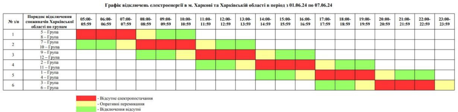 «До уваги споживачів — таблиця з годинами вимкнень. Нагадаємо, червоним кольором виділено години без світла для вашої групи, жовтим — години, в які електроенергія може зникнути через оперативні перемикання. Зеленим кольором позначено період, у який світло буде за умови стабільної ситуації в енергосистемі», — йдеться у дописі.