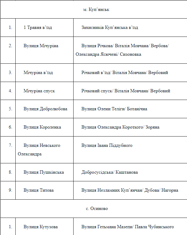 Нові назви пропонуються для десяти вулиць. Зокрема, в’їзд 1 Травня у Куп’янську хочуть перейменувати в Захисників Куп’янська, а вулицю Олександра Невського змінити на Івана Піддубного.