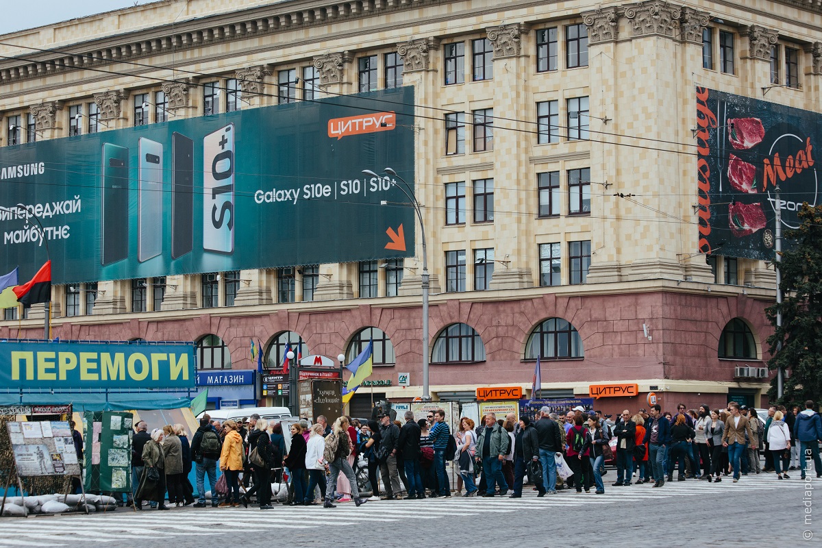 Учасники акції в центрі Харкова збирають підписи під зверненням до депутатів міськради і членів виконкому проти знесення намету «Все для перемоги» на майдані Свободи.
