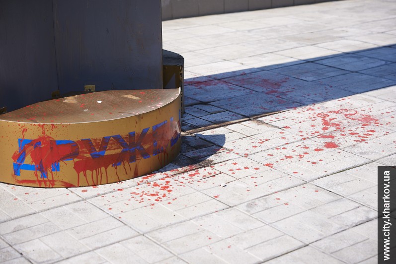 Сегодня ночью неизвестные разрисовали стелу, установленную в знак дружбы между Украиной и Россией, в сквере «Дружба» на Московском проспекте. На восстановление памятного знака понадобится около недели.