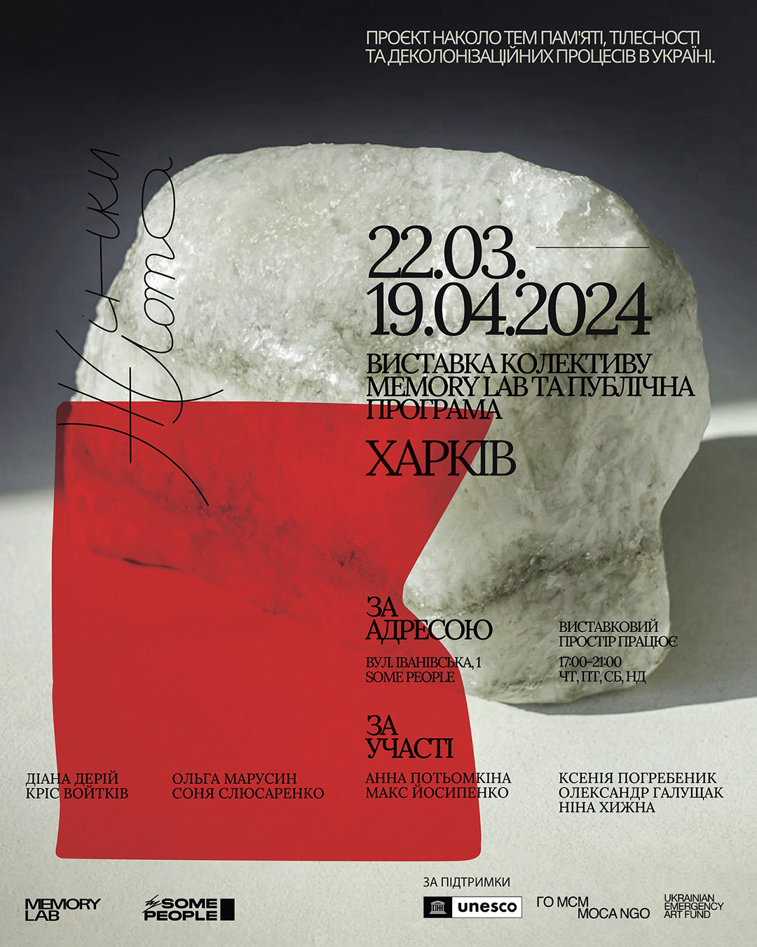 З 22 березня по 19 квітня у просторі Some People працюватиме проєкт колективу Memory Lab «Жінки Лота». Проєкт складається з виставки і публічної програми, його основний фокус: жіночий голос, взаємозв’язок пам’яті та тіла і деколоназіаційні процеси.