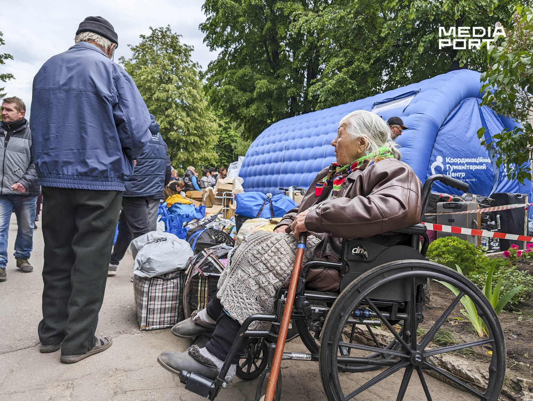 Вранці 15 травня в евакуаційному пункті у Харкові, куди привозять жителів прикордонних громад Харківщини, чутно плач. Більшість з евакуйованих — літні люди. Олену Бородавку вивезли з Лосівки, села неподалік Вовчанська. До Харкова вона приїхала без чоловіка.