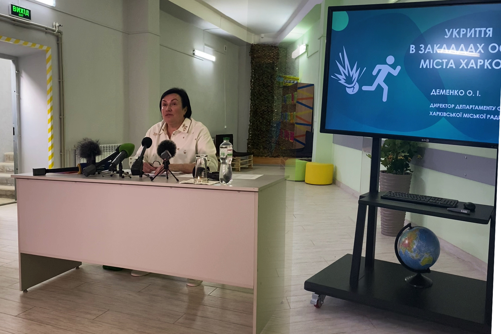 Ольга Деменко: Аби скоротити час нашого спілкування, відео ви вже подивилися (на екрані телевізора журналістам показують фото і відео укриттів у закладах освіти Харкова)? Ми скільки встигли, стільки підготували для вас фотографії тих укриттів, які у нас є. Бо ситуація склалася вчора (Синєгубов заявив, що йому невідомо про відповідні укриття у школах Харкова — ред.), тому під час мого виступу тут буде йти без озвучення відео, фотографії, аби ви бачили, що ми вам не брешемо.