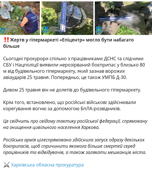 За 80 метрів від гіпермаркету виявили авіаційний боєприпас, що не розірвався. Слідчі з’ясували, що удари росіяни корегували безпілотниками.
