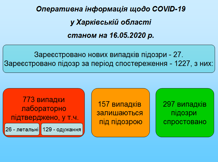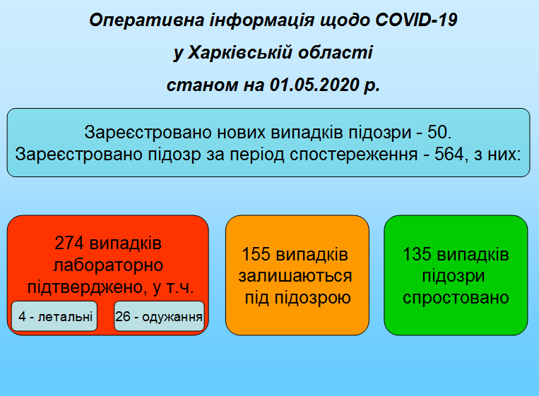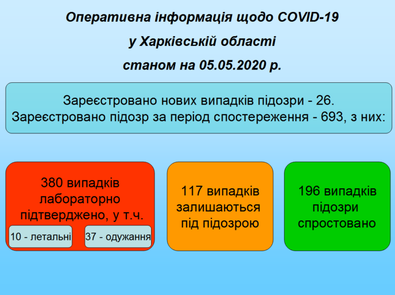 10:30 +1 померлий з СOVID на Харківщині (всього 94), +24 хворих (всього підтверджено 2371), +26 одужали (всього 1225), повідомляє лабцентр.