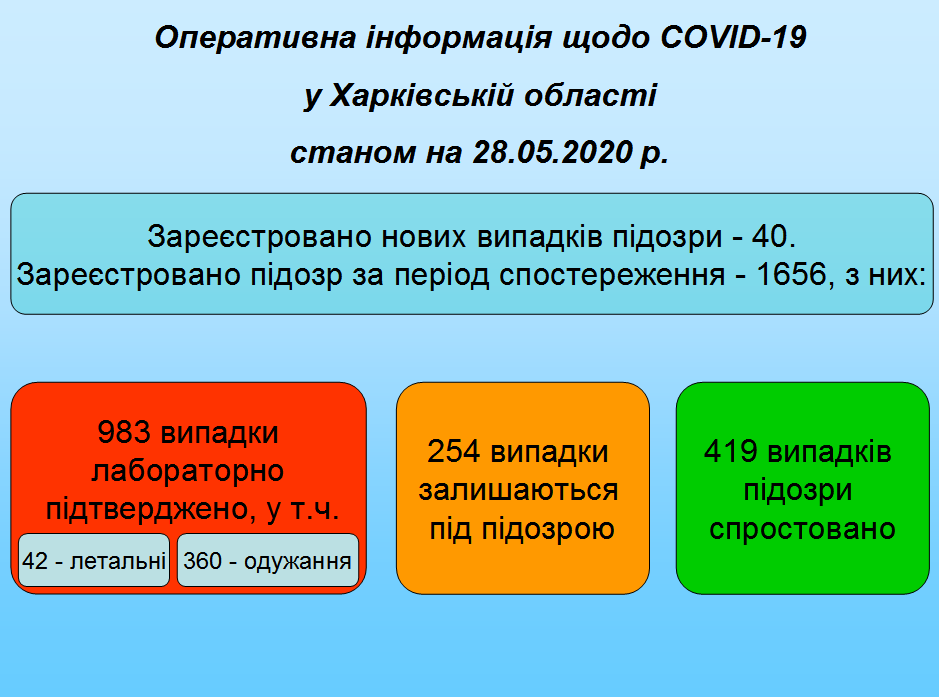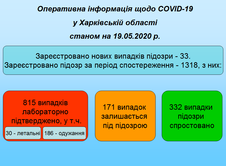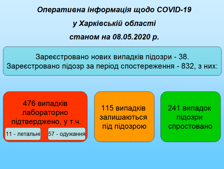 11:30 +1 померлий пацієнт на Харківщині (всього 111), +46 хворих (за весь час підтверджено 2724 випадки), +28 одужали (всього 1484), повідомляє лабценр.