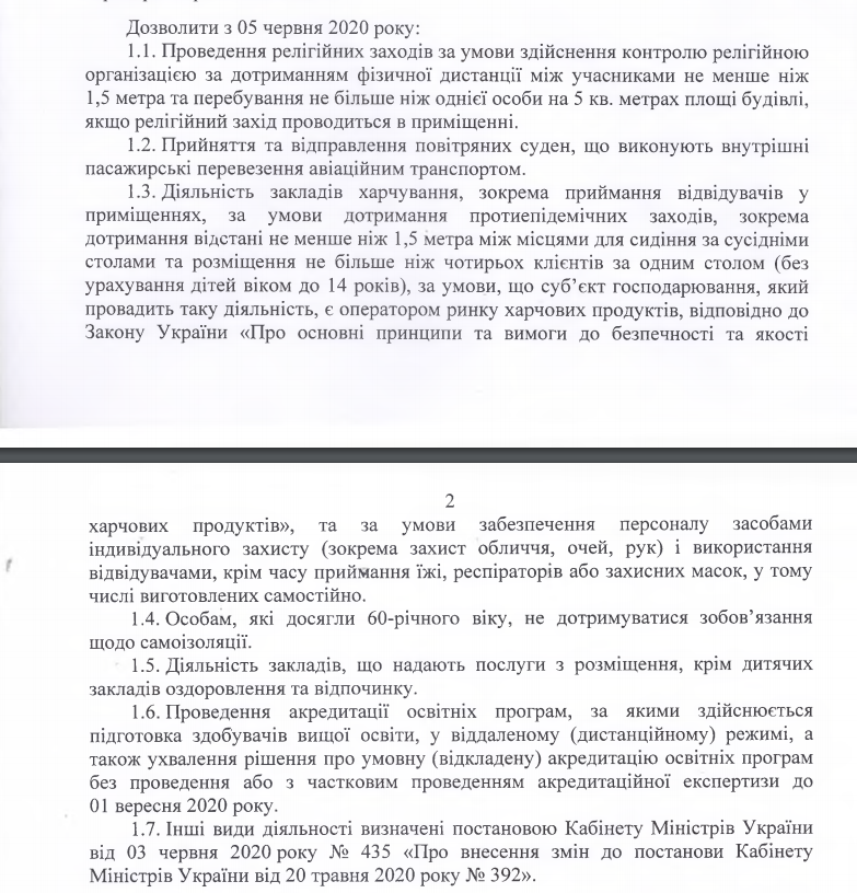 - Дозволити роботу кінотеатрів за умови забезпечення контролю щодо виконання заходів дезінфекції, використання засобів індивідуального захисту та дотримання соціальної дистанції.