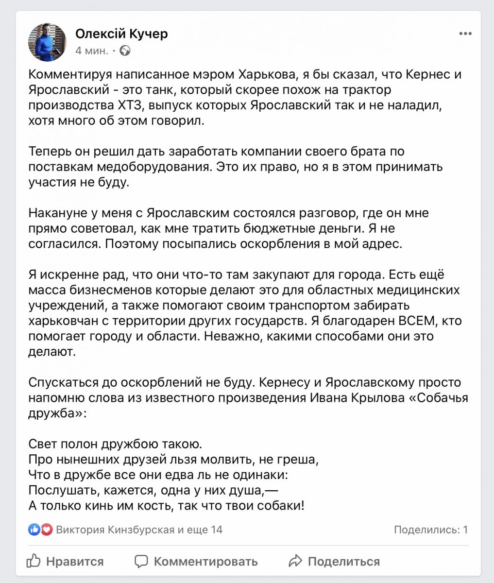 «Я як міський голова проти таких заходів. Це зроблено центральною владою без будь-яких консультацій з органами місцевого самоврядування. Ситуація з карантином говорить ще і про те, що Україні просто необхідна справжня, а не фейкова, децентралізація, і я вважаю, що це питання перед Верховною Радою повинна поставити Асоціація міст України», — заявив мер Харкова Геннадій Кернес.
