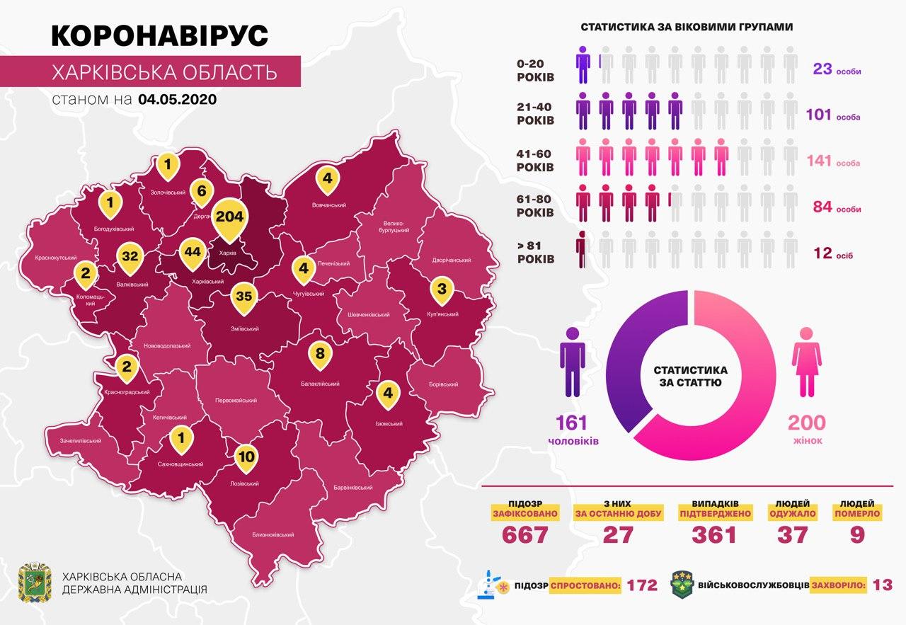 12:00 +4 померлих СOVID-19 за добу на Харківщині (всього 84), +38 хворих (всього підтвержено 2171), +16 одужали (всього 1103) — лабцентр.